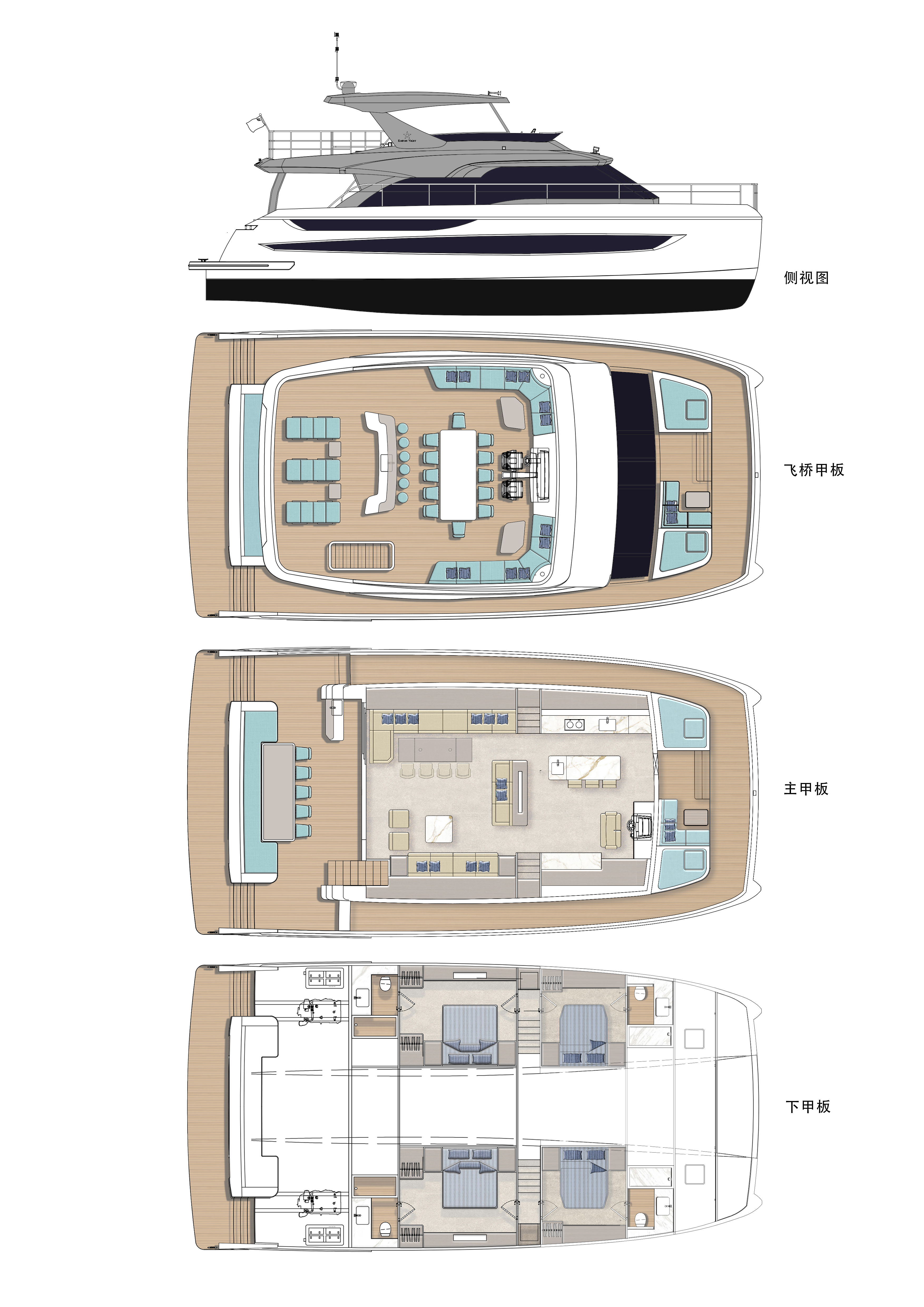 TY680双体游艇以突破性设计重塑海上生活美学。其外形采用超前创新轮廓,流畅干练的弧线勾勒出饱满优雅的身姿,既彰显尊贵气度,又将功能性与美感完美融合。