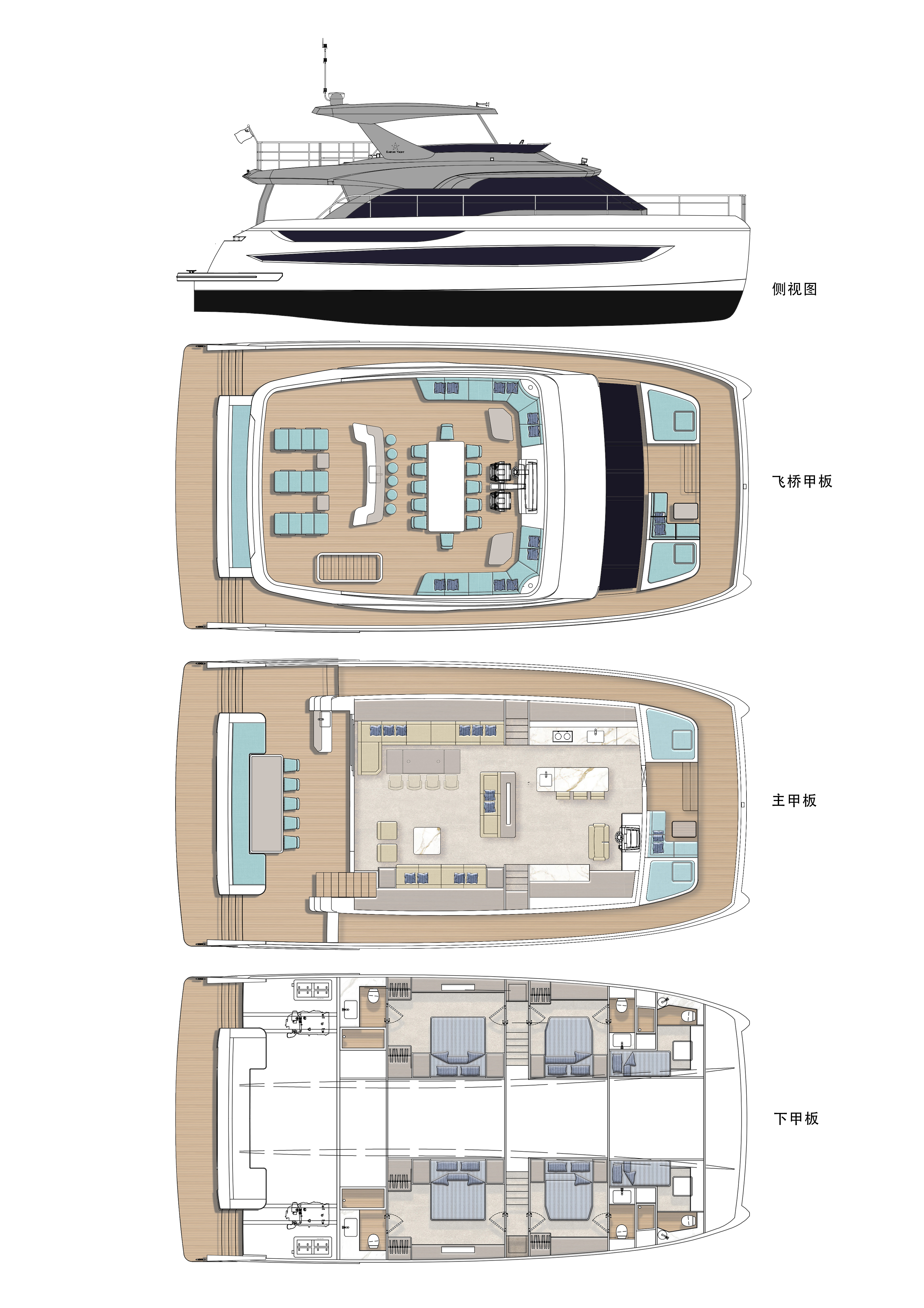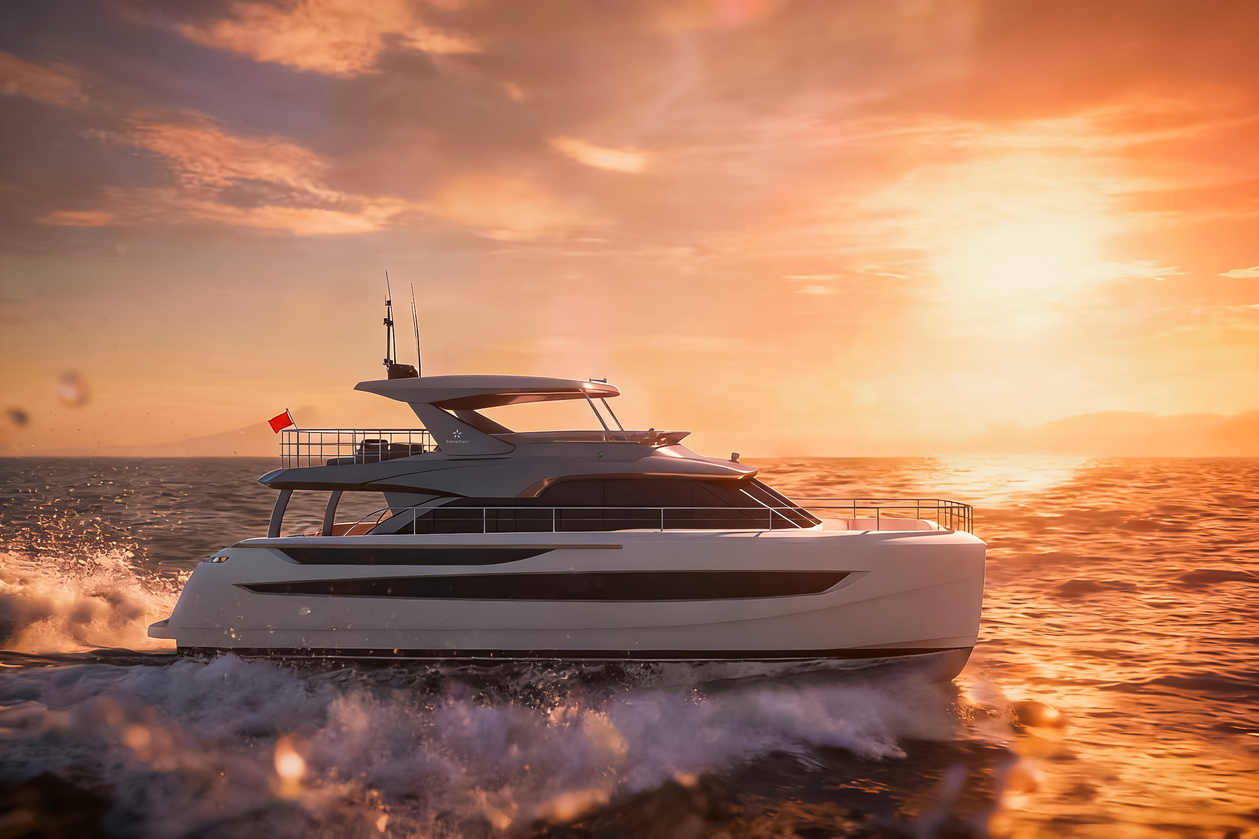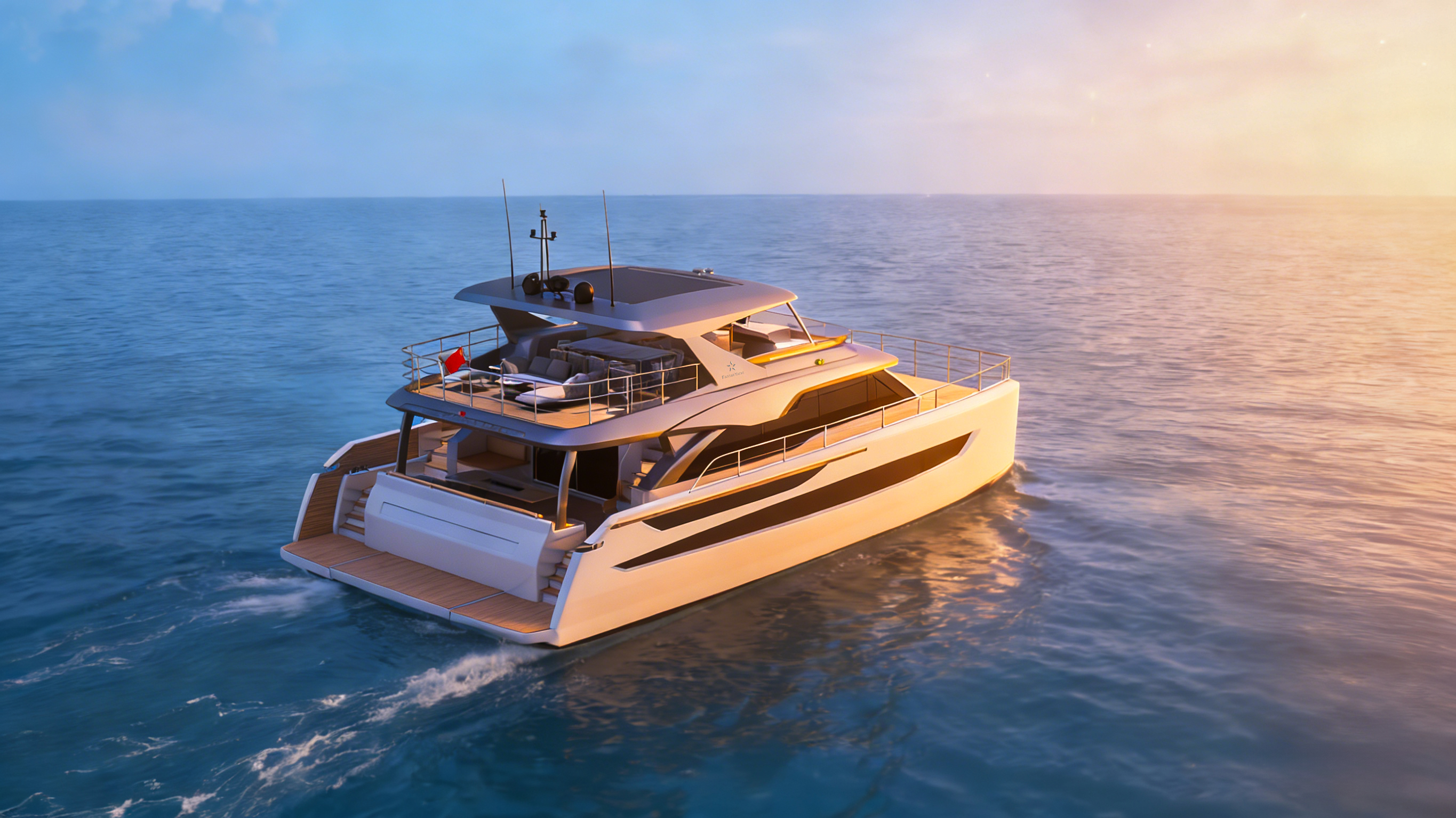 TY680双体游艇以突破性设计重塑海上生活美学。其外形采用超前创新轮廓,流畅干练的弧线勾勒出饱满优雅的身姿,既彰显尊贵气度,又将功能性与美感完美融合。
