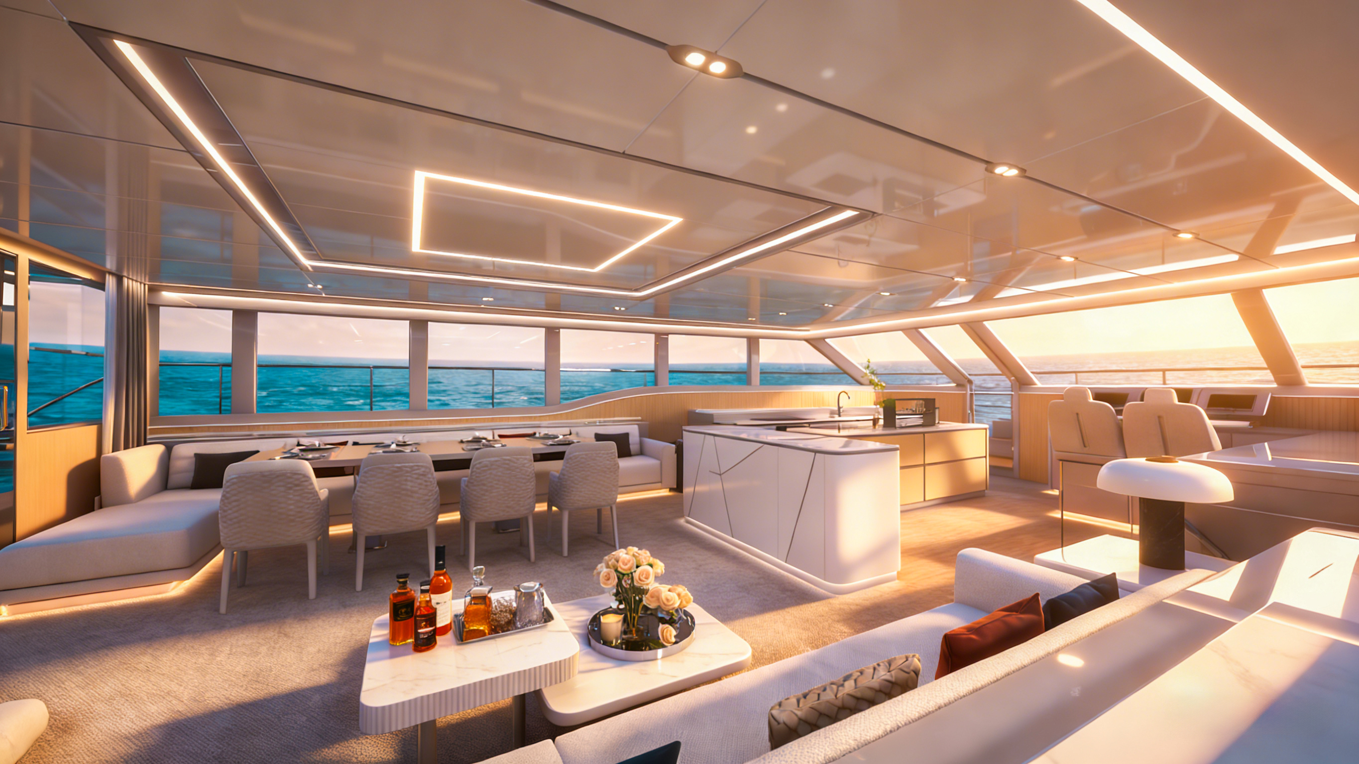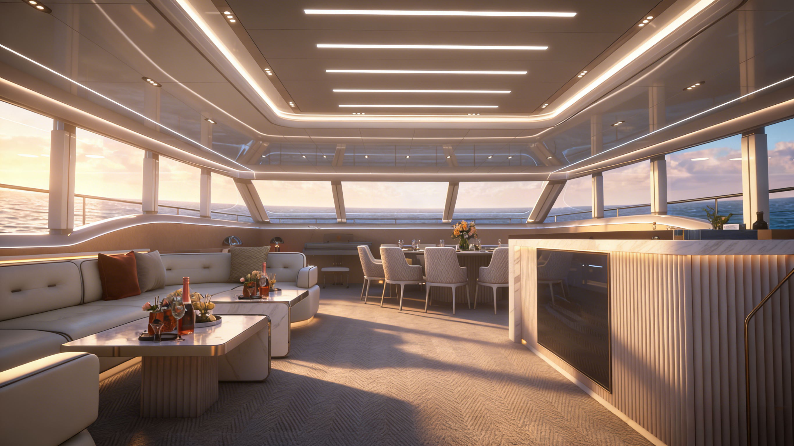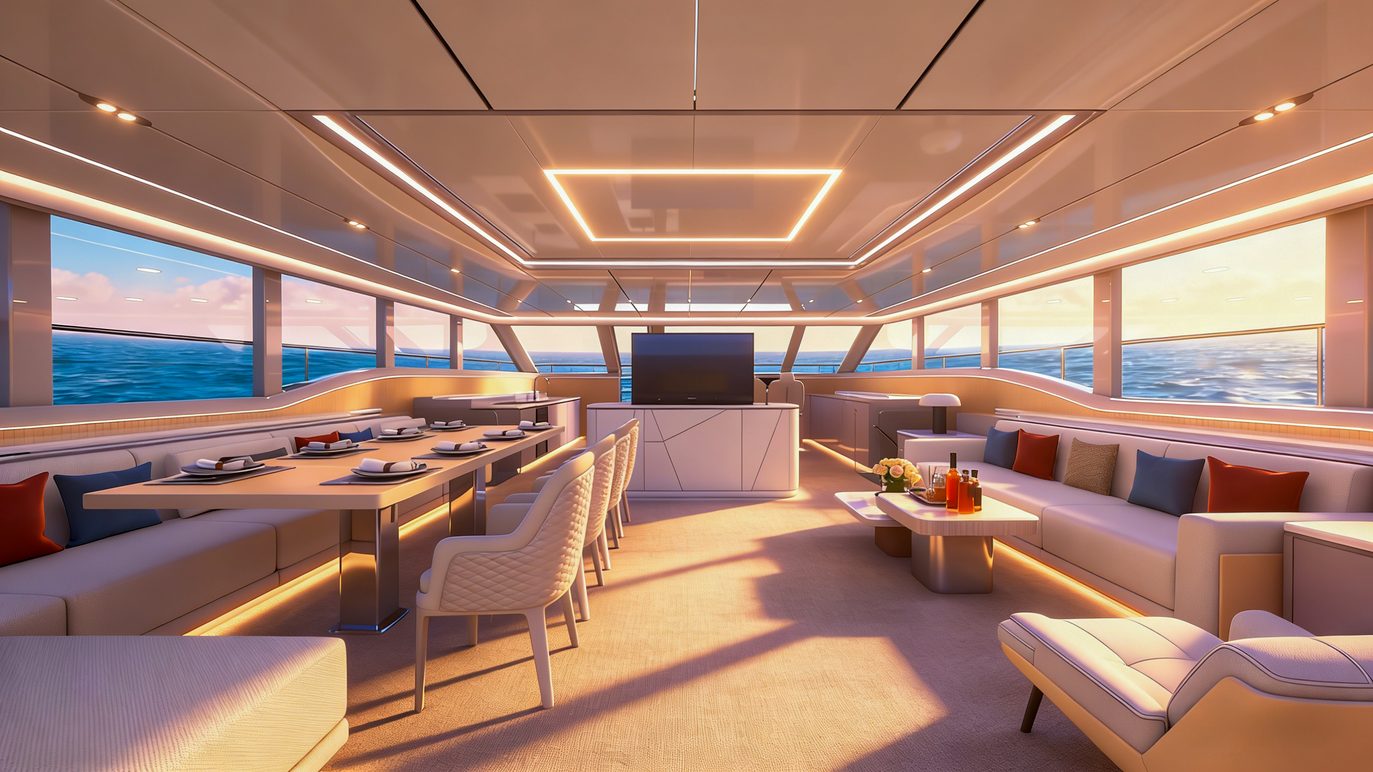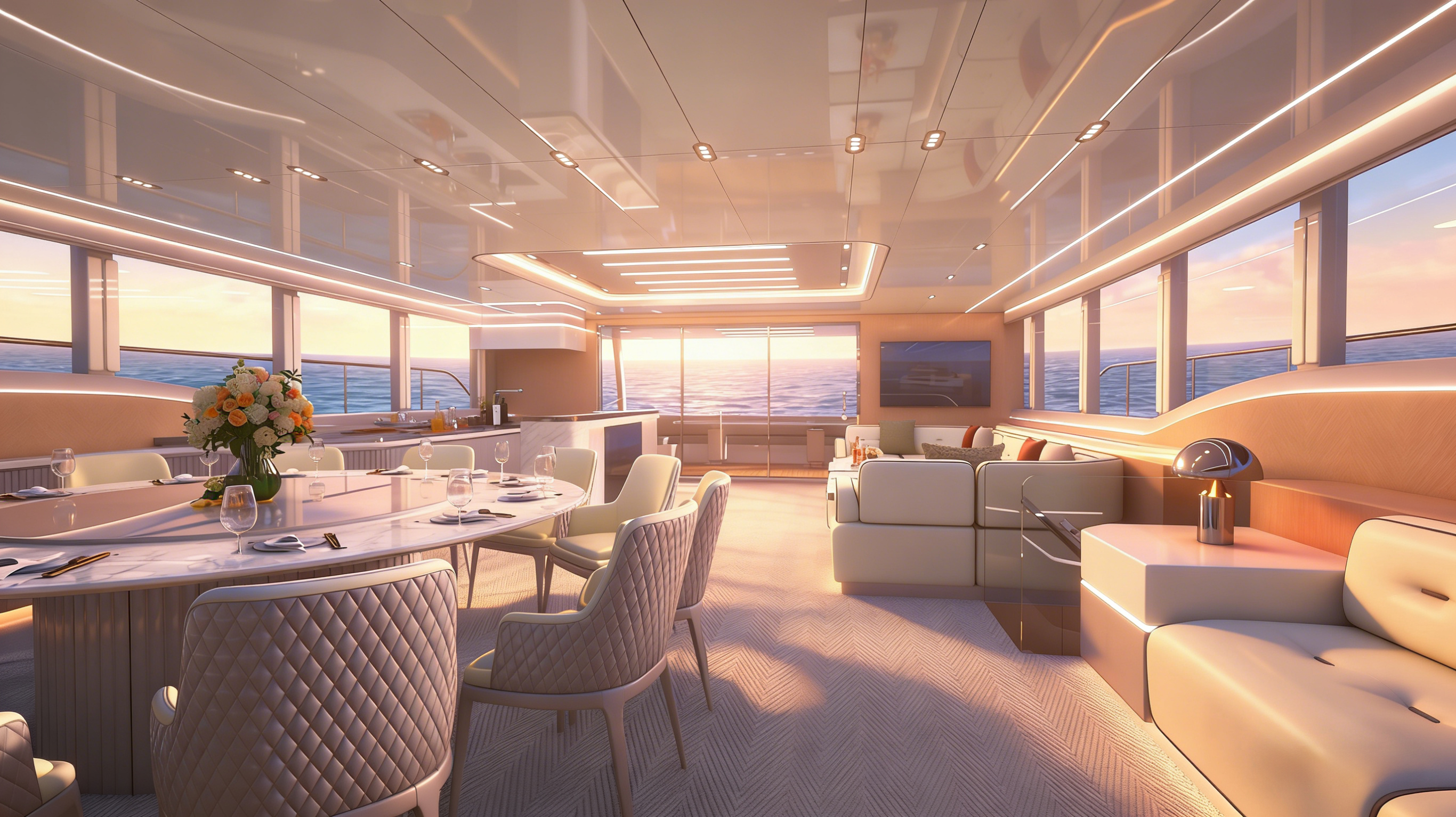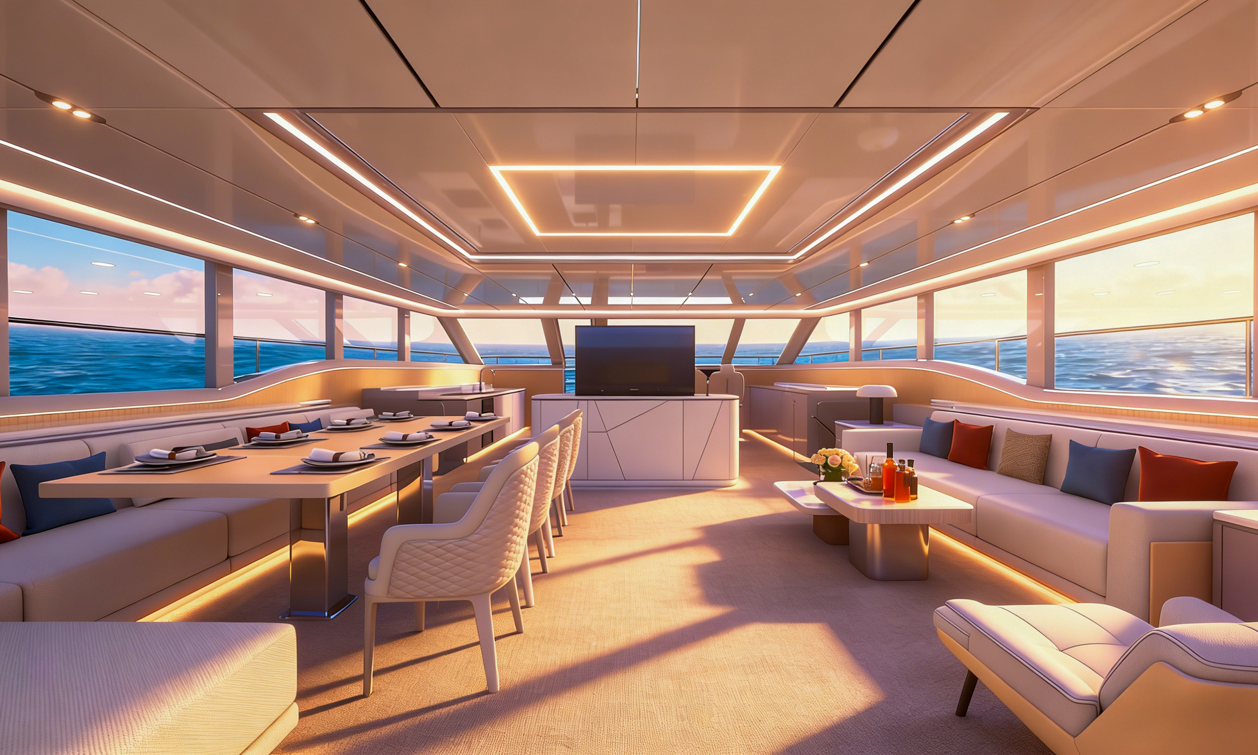 商务沙龙区堪称海上多功能空间典范,超大视野窗户打破空间界限,将海天盛景引入室内。这里集餐饮、娱乐、休闲功能于一体,无论是商务洽谈还是亲友聚会,都能在奢华舒适的氛围中完美进行。