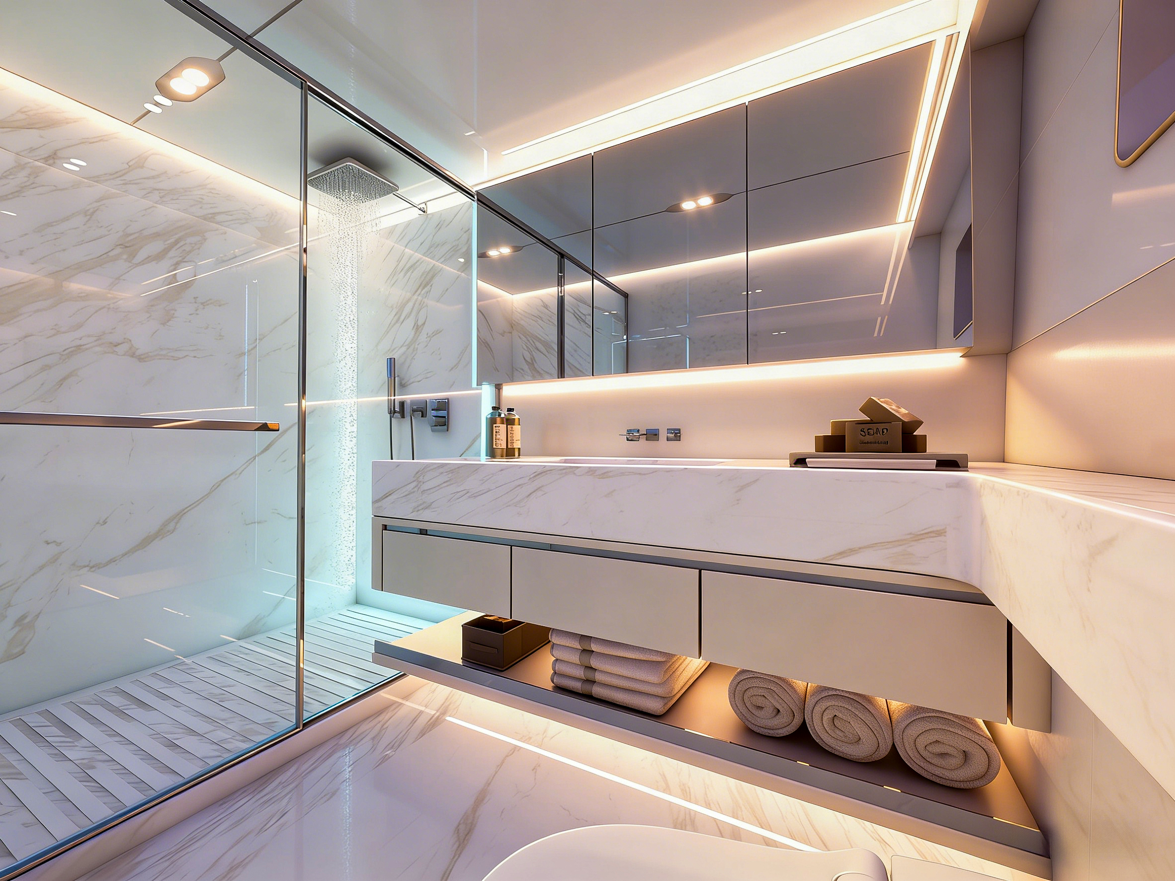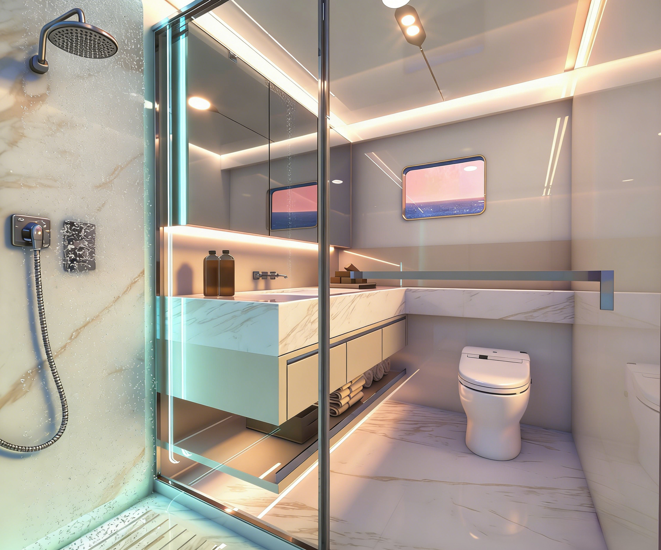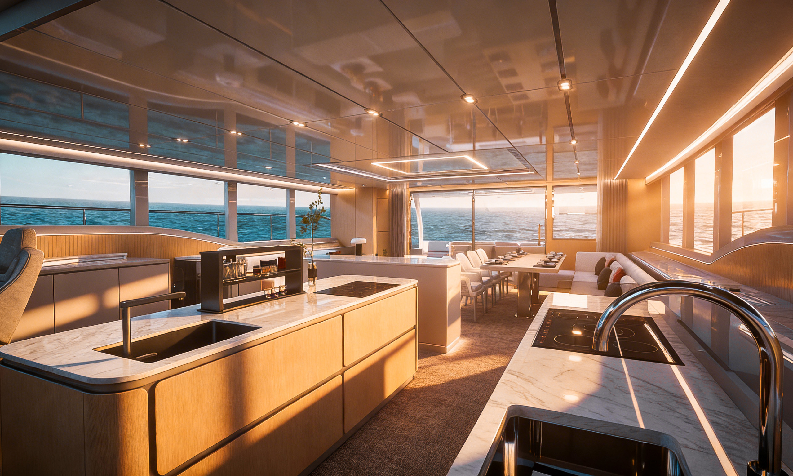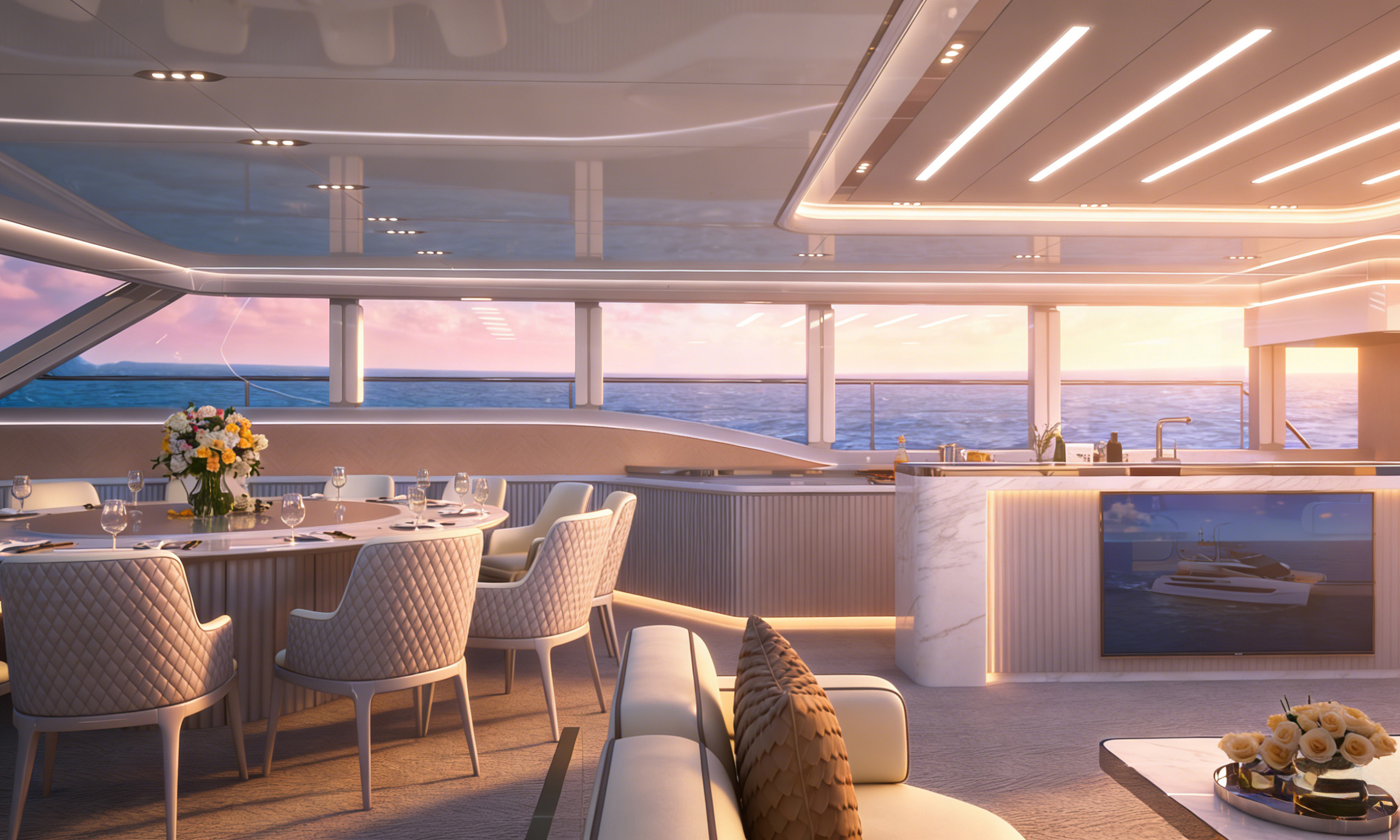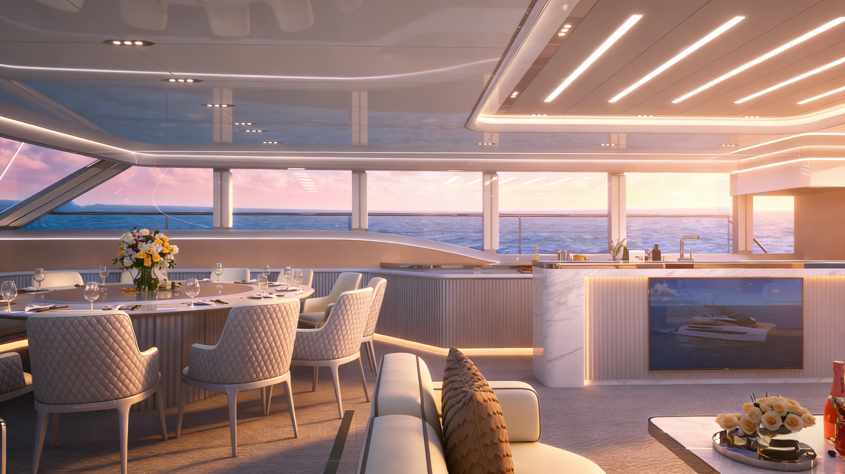 商务沙龙区堪称海上多功能空间典范,超大视野窗户打破空间界限,将海天盛景引入室内。这里集餐饮、娱乐、休闲功能于一体,无论是商务洽谈还是亲友聚会,都能在奢华舒适的氛围中完美进行。